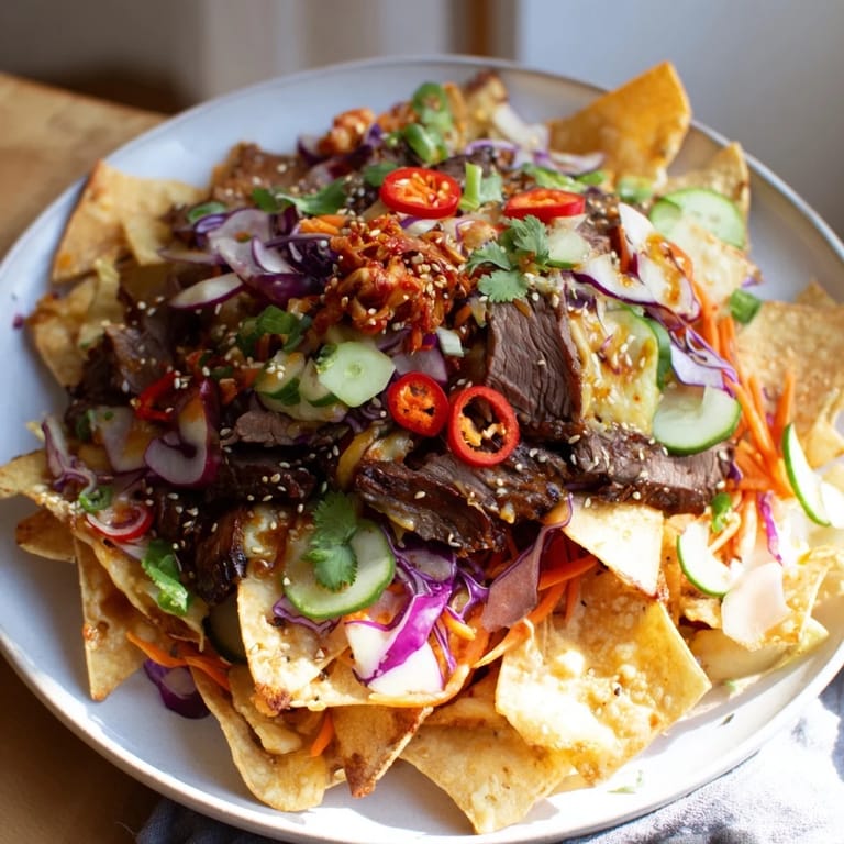 Save to Pinterest I discovered Korean BBQ nachos by accident at a late-night dinner party when I ran out of traditional toppings and decided to raid my pantry for gochujang and kimchi. The result was so unexpectedly delicious that my friends asked for the recipe before they'd even finished eating. Now whenever I need something that feels both familiar and exciting, this is what I make—crispy chips layered with spicy marinated beef, melted cheese, and all the fresh vegetables that make every bite feel like a little flavor explosion.