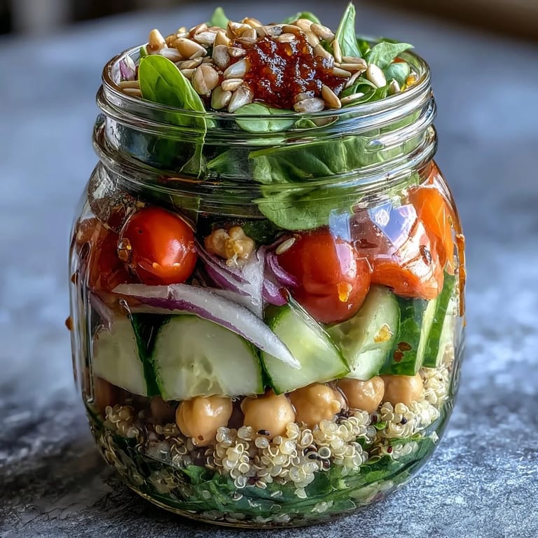 Save to Pinterest Embrace the ease and vibrancy of summer meal prep with these colorful Mason Jar Salads. Layered for freshness and designed to stay crisp throughout the week, these salads combine wholesome ingredients like baby spinach, quinoa, and chickpeas into portable jars perfect for busy days. Whether you're looking for a quick lunch or a nutritious main dish, these customizable jars bring together flavors and textures that delight while keeping prep simple and mess-free.