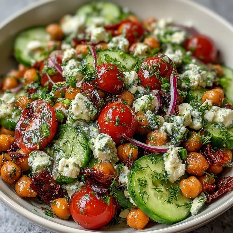 Save to Pinterest My neighbor Maria showed up at my door one sweltering July afternoon with a bowl of this salad and a knowing smile, saying it was the only thing she ate when the heat made cooking feel impossible. I took one bite of that cool, tangy mixture and understood instantly why she'd become obsessed. The chickpeas gave it substance without heaviness, and that lemon-oregano dressing tasted like someone had bottled sunshine. I've made it at least fifty times since, and it never gets old.