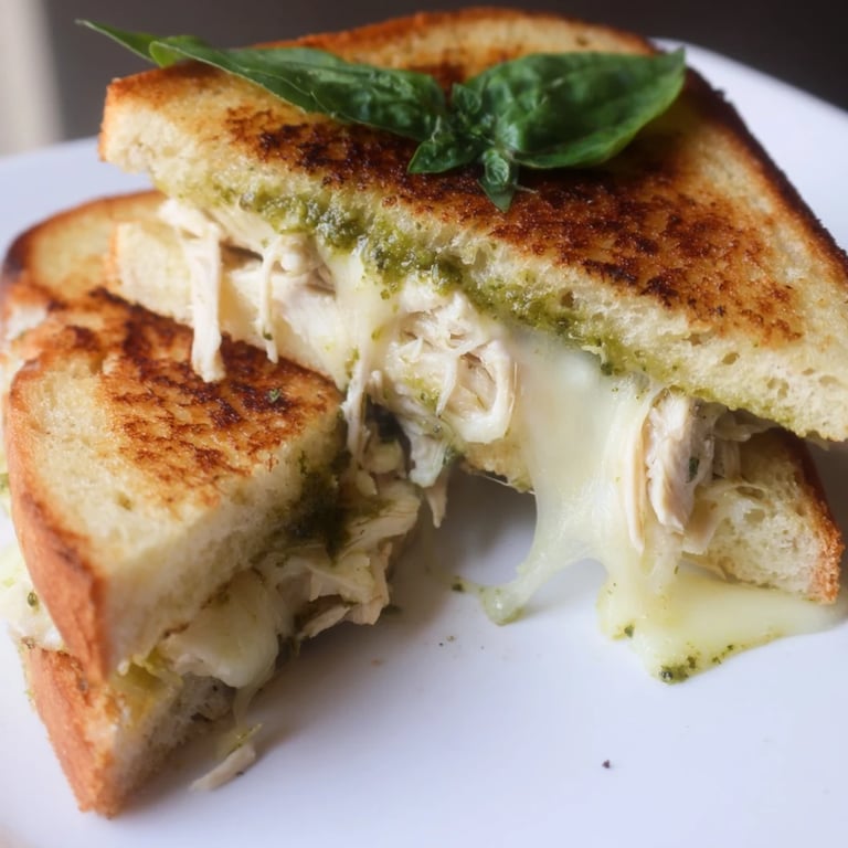 Save to Pinterest The first time I made this sandwich, I was just trying to use up leftover rotisserie chicken and half a jar of pesto sitting in the fridge. My kitchen smelled like basil and butter, and I remember standing there watching the cheese bubble through the bread's crust, completely mesmerized.