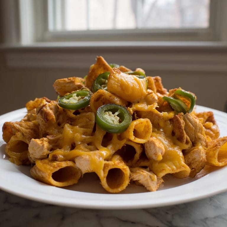 - Pile the crispy pasta chips on a platter, scatter the seasoned chicken over the top, then layer on shredded cheddar and jalapeño slices. Pop the whole thing back in the air fryer for two to three minutes, just until the cheese melts and starts to bubble at the edges.