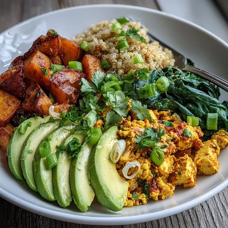 This bowl is excellent for meal prep. Portion cooked quinoa, tofu scramble, and roasted sweet potatoes into separate containers. Add fresh spinach and avocado just before eating to maintain optimal texture and freshness. The flavors actually deepen overnight as the seasonings meld together.