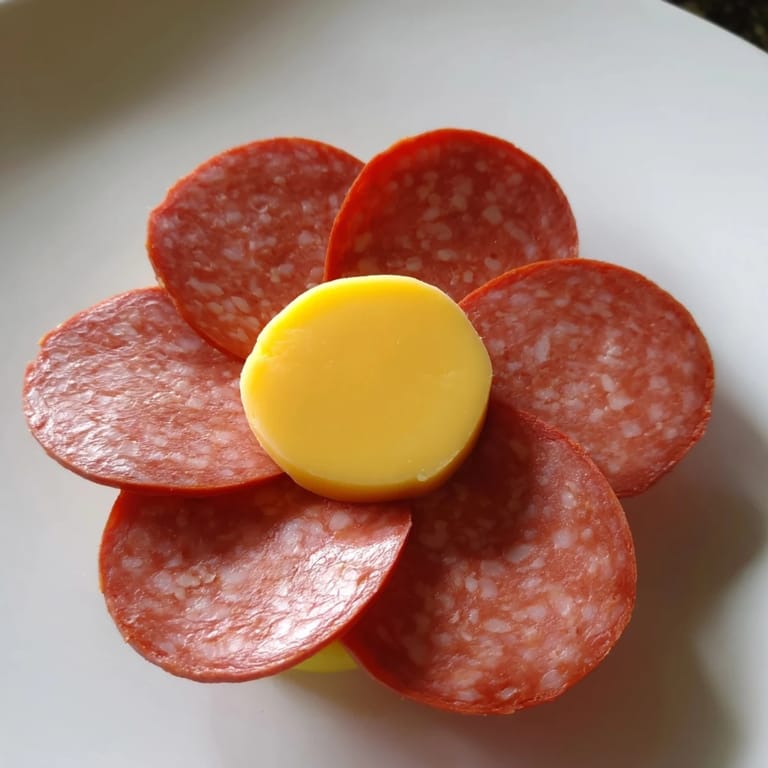 - Nestle that yellow cheese round in the very center, letting it cover where all those salami edges meet. Step back and look—you'll see the flower shape come to life instantly.